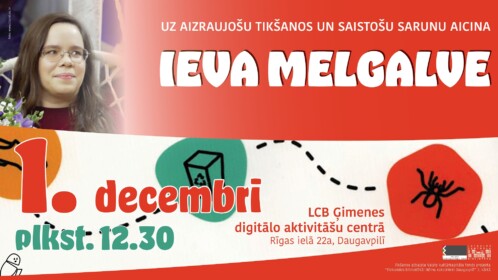 Ceturtdien, 1. decembrī, plkst. 12.30 Latgales Centrālās bibliotēkas Ģimenes digitālo aktivitāšu centrā (Rīgas ielā 22a) notiks tikšanās ar rakstnieci, tulkotāju un reklāmas tekstu autori Ievu Melgalvi. Visi interesenti tiek aicināti uz sarunu par autores daiļradi, daiļdarbu tekstos lasīto, dzirdēto, redzēto un sajusto. Tikšanos atbalsta Valsts kultūrkapitāla fonds projekta “Tiekamies bibliotēkā! Bērnu rakstnieki Daugavpilī” 3. kārtā.