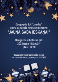 2023.gada 18.janvārī plkst.14.00 Daugavpils pilsētas Bērnu un jauniešu centrs “Jaunība” aicina Daugavpils vispārizglītojošo skolu 1.-6.klašu skolēnus apmeklēt radošo kolektīvu koncertu, kas notiks Daugavpils Kultūras pilī.