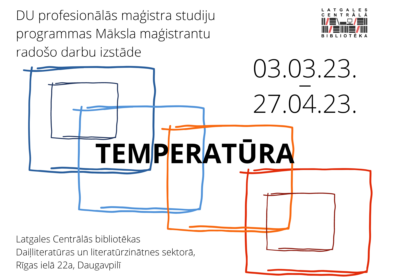 No š.g. 3.marta līdz 27.aprīlim Latgales Centrālās bibliotēkas (LCB) Daiļliteratūras un literatūrzinātnes sektorā (Rīgas ielā 22a, Daugavpilī) ir skatāma Daugavpils Universitātes (DU) profesionālās maģistra studiju programmas (PMSP) Māksla maģistrantu radošo darbu izstāde TEMPERATŪRA.