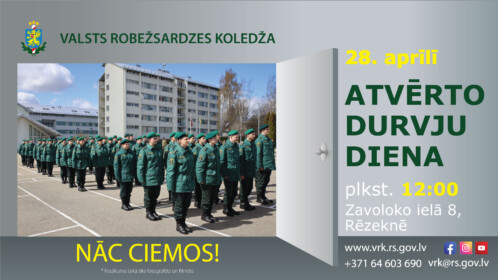 Valsts robežsardzes koledža aicina 28.aprīlī uz Atvērto durvju dienu, kas notiks Rēzeknē, Zavoloko ielā 8. Koledžas durvis visiem interesentiem būs atvērtas no plkst.12.00 līdz plkst.15.00. Dalībnieku reģistrācija no plkst.11.00.