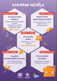 Katrā no Karjeras nedēļas dienām skolēni varēs atklāt un attīstīt sev interesējošās prasmes – vispārīgās jeb caurviju prasmes, personīgās prasmes, profesionālās prasmes, taču trešdien īpaša uzmanība būs veltīta IT prasmēm, pildot IT eksāmenu, 5.-12. klašu jaunieši varēs pārbaudīt savas prasmes IT jomā. Nedēļas noslēgumā visas iegūtās zināšanas par prasmēm katram skolēnam būs iespēja apkopot savā prasmju portfelī, kas šogad izvēlēts kā Karjeras nedēļas simbols.