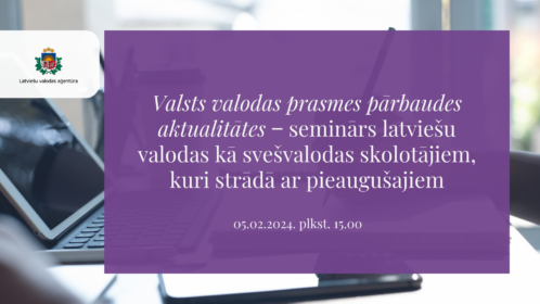 Latviešu valodas kā svešvalodas skolotājus aicina 5.februārī plkst.15.00 piedalīties Latviešu valodas aģentūras seminārā, lai iepazītos ar valsts valodas prasmes pārbaudes aktualitātēm 2024.gadā.