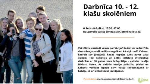 Nākamnedēļ, 6.februārī, Daugavpilī viesosies Gētes institūta delegācija, lai apspriestu sadarbības iespējas. Daugavpils valstspilsētas pašvaldības vispārizglītojošo izglītības iestāžu vidusskolēniem (kas apgūst vācu valodu) un studentiem (arī bez vācu valodas zināšanām) tiks piedāvātas divas darbnīcas.