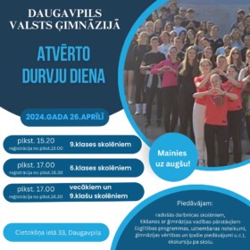 26. aprīlī Daugavpils Valsts ģimnāzija rīko Atvērto durvju dienu. Īpaši tiek aicināti 6. un 9. klašu skolēni un viņu vecāki.