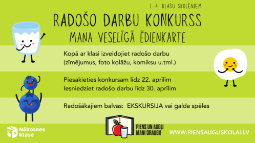 Sacensību gars ir lieliska motivācija zināšanu apguvei, tāpēc Lauku atbalsta dienests sadarbībā ar Ventspils Augsto tehnoloģiju parku aicina 1.- 4. klašu skolēnus piedalīties radošo darbu konkursā “Mana veselīgā ēdienkarte”, kas tiek organizēts kā viena no programmas “Piens un augļi skolai” aktivitātēm.