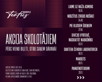 Par godu gaidāmajai Skolotāju dienai Daugavpils teātris dāvina skolotājiem un jebkurai personai, kura strādā izglītības iestādē, iespēju apmeklēt vairākas izrādes akcijas „1+1” ietvaros: iegādājoties biļeti uz jebkuru no piedāvātajām izrādēm, otru biļeti saņemsiet dāvanā!
