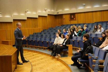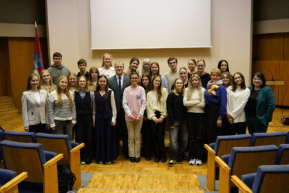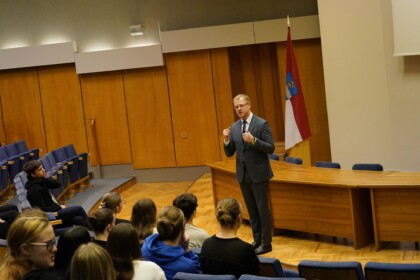 Šī gada 9.decembrī skolu pašpārvalžu līderi devās apmeklēt Daugavpils valstspilsētas pašvaldības domi, lai tiktos ar domes priekšsēdētāju Andreju Elksniņu un diskutētu par sev interesējošām tēmām, kā izglītība, karjeras iespējas, brīvais laiks, jauniešu nodarbinātība vasarā u.c. A.Elksniņa kungs labprāt atbildēja uz jauniešu uzdotajiem jautājumiem, kā arī dalījās stāstos par savām izglītības gaitām un karjeras izaugsmi, vērtībām savā dzīvē, vienlaikus mudinot jauniešus aizdomāties par savām vērtībām, prasmēm un iespējām nākotnē.