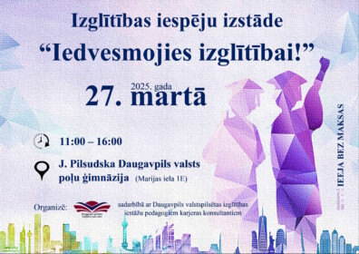 Lai mudinātu skolēnus izzināt mūsdienīgas izglītības iespējas Daugavpilī un visā Latvijā, Daugavpils pilsētas Izglītības pārvalde sadarbībā ar izglītības iestāžu pedagogiem karjeras konsultantiem aicina uz izglītības izstādi “Iedvesmojies izglītībai!”. Izstāde notiks šī gada 27.martā no plkst.11.00 līdz plkst.16.00 J. Pilsudska Daugavpils valsts poļu ģimnāzijas telpās (Marijas ielā 1E, Daugavpilī). Izstādi apmeklēt tiek aicināti visi interesenti – gan Daugavpils pilsētas un Augšdaugavas novada vispārizglītojošo skolu skolēni, gan profesionālo izglītības iestāžu audzēkņi, skolēnu vecāki un pedagogi.