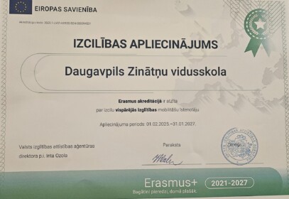Š.g. 12.martā Daugavpils Zinātņu vidusskola ir saņēmusi izcilības apliecinājumu no Valsts izglītības attīstības aģentūras (VIAA) par augstiem sasniegumiem Erasmus+ akreditācijas īstenošanā vispārējās izglītības mobilitātēs. Šī prestižā atzinība tiek piešķirta izglītības iestādēm, kuru projektu atskaites par īstenoto gada darbu, tostarp mobilitātēm, aktivitātēm rezultātu izplatīšanā un sadarbībā ar nacionālo aģentūru, ir novērtētas ar vairāk nekā 85 punktiem no 100. Mūsu skolas projekti ir sasnieguši izcilu vērtējumu – 96 punktus.
