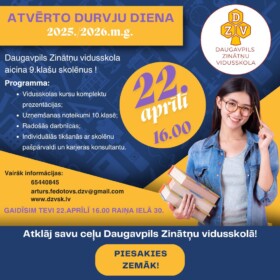 Daugavpils Zinātņu vidusskola aicina 9. klašu skolēnus š.g. 22. aprīlī plkst.16.00 (Raiņa ielā 30, Daugavpilī) piedalīties Atvērto durvju dienā.