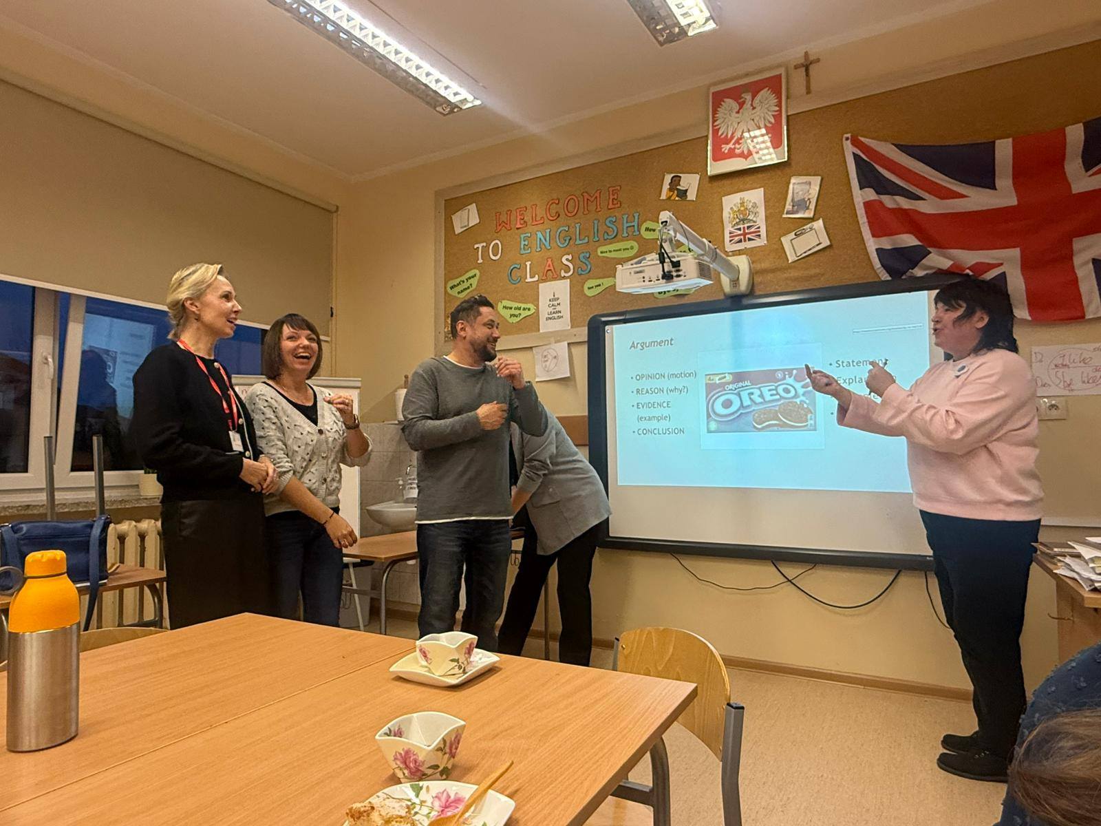 Savukārt novembra nogalē direktore Oksana Petaško un vietnieces Sandra Rutkovska un Renāte Malnace devās uz Mosty pamatskolu Polijā, lai poļu kolēģiem stāstītu par debatēm kā mācīšanās metodi: par K.Popera debašu programmas pamatprincipiem un to izmantošanu mācību procesā. Poļu skolotāji apguva argumentu veidošanas pamatus, debašu struktūru, debašu kā darba formas izmantošanu mācību procesā dažādos mācību priekšmetos un iesaistījās debatēs par to, vai visās Eiropas Savienības valstīs būtu jāievieš 4 dienu darba nedēļa. Savukārt ar poļu skolēniem tika organizēta saruna par skolēnu līdzpārvaldes funkcijām, par izglītības procesa atšķirībām Latvijā un Polijā.